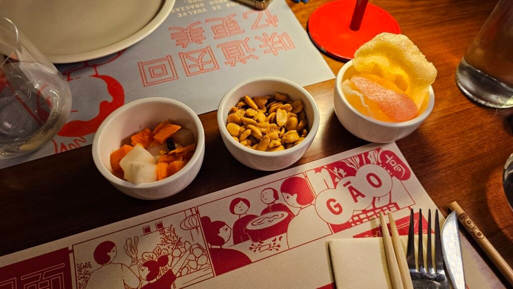 Nada más llegar, te reciben con un aperitivo de cortesía: maní picante, snacks de camarón y pickles suaves.