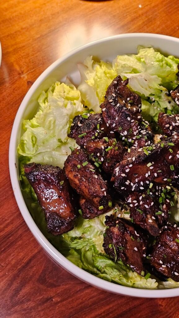 - Cerdo laqueado a la miel: tipo fiambre sobre lechugas, muy rico aunque otros platos nos sorprendieron más.