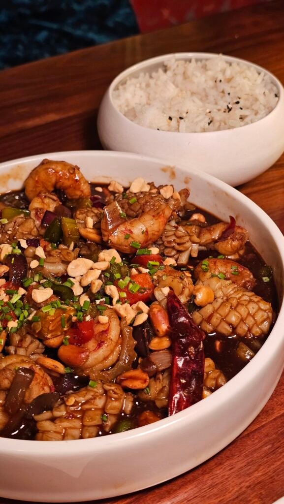 - Mariscos al gong bao ⭐: cazuela de camarones y calamar en tiritas con maní y una salsa picante deliciosa. Pura proteína. Es picante, pero lo justo y necesario.